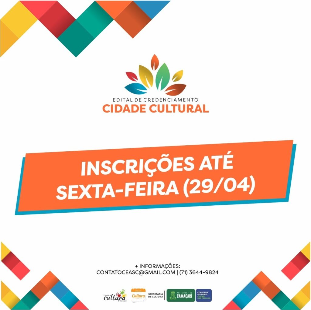 As inscrições para o edital de credenciamento Cidade Cultural devem ser realizadas até sexta-feira (29/4). Com investimento total estimado em R$ 1 milhão, com recursos próprios, a iniciativa possibilita aos artistas e grupos culturais estarem aptos a realizar apresentações em eventos da Prefeitura de Camaçari ou que representem a cultura do município em outras localidades.
