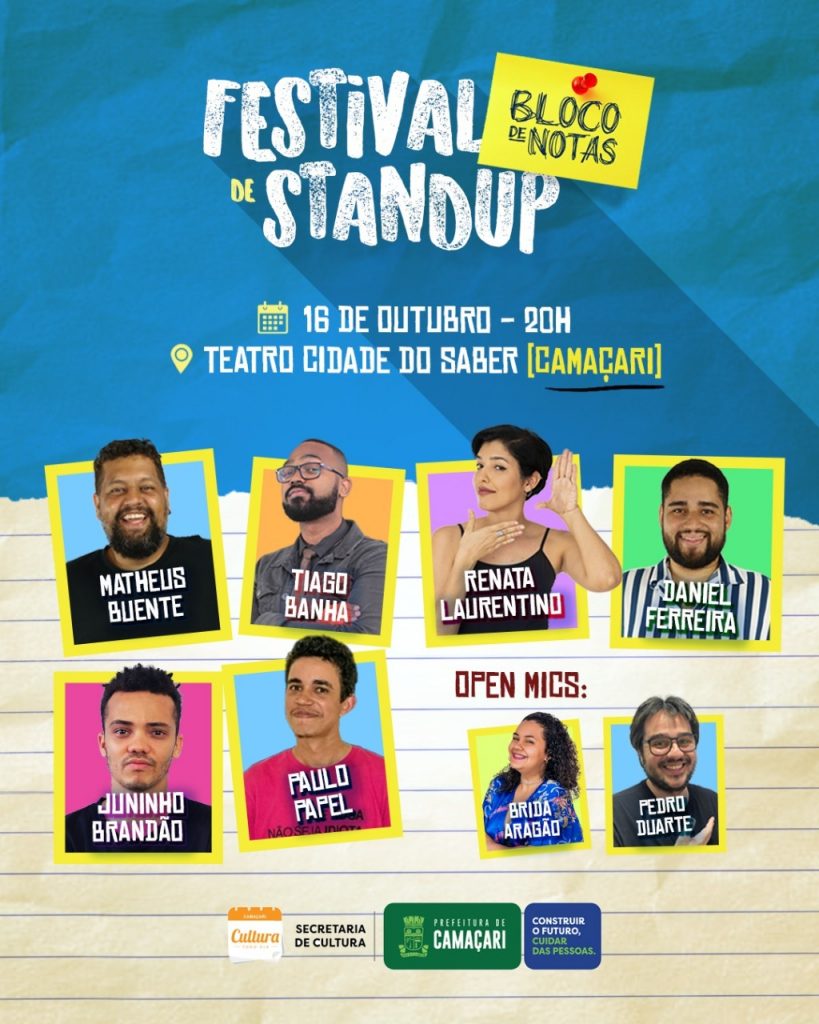Sempre com lotação total das casas por onde passa desde 2018, o festival de stand up Bloco de Notas já é reconhecido como um dos maiores eventos de testes de piada do Norte/Nordeste atualmente, tanto pelo público que atrai quanto pela frequência. Primeira vez Camaçari, o evento, que tem patrocínio da Secretaria da Cultura (Secult), levará para o palco do Teatro Cidade do Saber, no dia 16 de outubro, às 20h, oito comediantes.