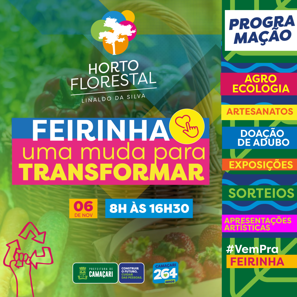 A Secretaria do Desenvolvimento Urbano e Meio Ambiente (Sedur) promove, neste domingo (6/11), a 5ª edição da feirinha “Uma muda para transformar” no Horto Florestal Linaldo da Silva. A ação, que tem como proposta proporcionar uma experiência com o meio ambiente, será realizada das 8h às 16h30.