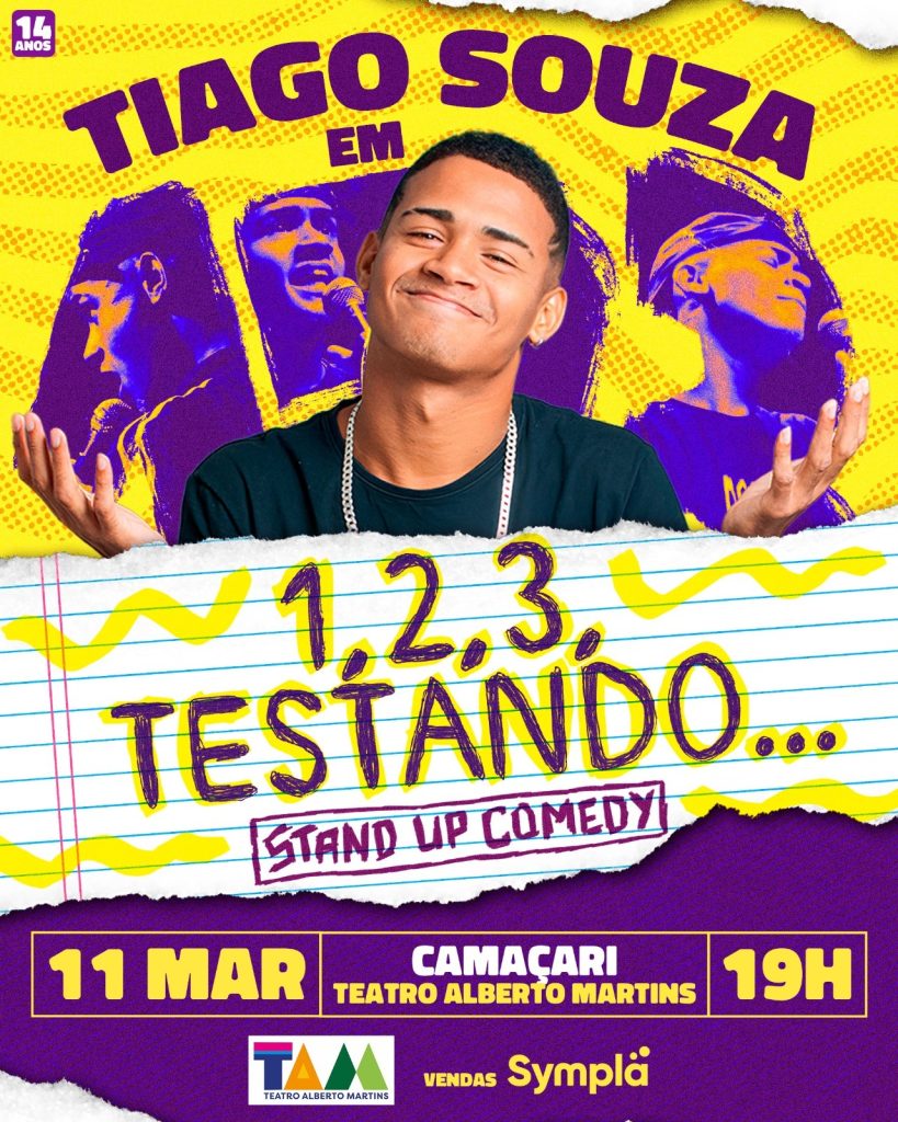 Pela primeira vez em Camaçari, o humorista e influenciador soteropolitano, Tiago Souza, irá apresentar o seu mais novo stand up comedy entitulado “1…2…3… testando…” com participações de comediantes locais. Em seu retorno aos palcos baianos, ele contará sua relação com amigos, família, relacionamentos, além de situações de sua própria vida. A Apresentação vai acontecer no dia 11 de março às 19 horas no Teatro Alberto Martins, com ingressos a R$30 (meia), R$60 (inteira) e R$40 + 1kg de alimento (entrada solidária).