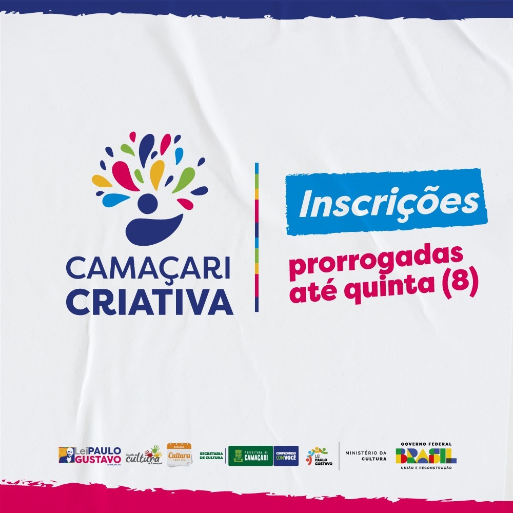 As inscrições para o edital de concurso cultural Camaçari Criativa, que encerrariam nesta segunda-feira (5/2), foram prorrogadas até quinta (8), às 12h. A iniciativa selecionará projetos nos diversos segmentos, com exceção do audiovisual, para receberem apoio financeiro, com o objetivo de incentivar as diversas formas de manifestação artísticas do município, tendo investimento total de R$ 649.585,76.