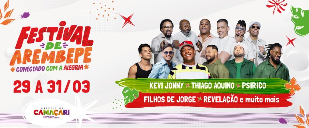 O Festival de Arembepe 2025, que vai agitar Camaçari entre os dias 29, 30 e 31 de março, está com a programação completa. Na Arena Principal (Palco Katita), uma das novidades é a quantidade de atrações, que passou de 11 para 12, aumentando as horas de interação e alegria.