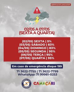 A Defesa Civil de Camaçari emitiu um alerta para a população devido à previsão de fortes chuvas nos próximos dias. Segundo o órgão, entre sexta-feira