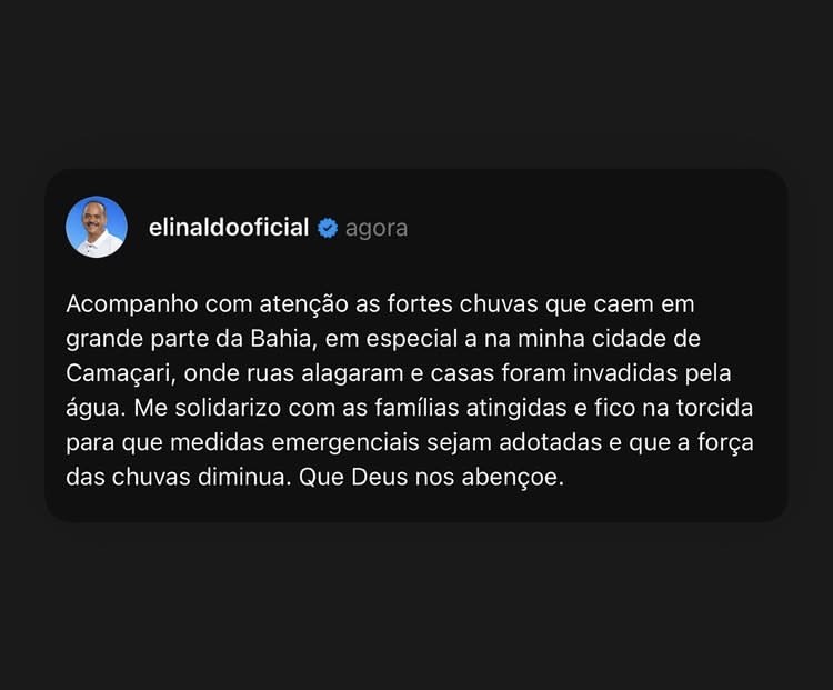 “Me solidarizo com as famílias atingidas e fico na torcida para que medidas emergenciais sejam adotadas e que a força das chuvas diminua. Que Deus nos abençoe”, escreveu Elinaldo, em publicação feita via Threads e compartilhada no Instagram.
