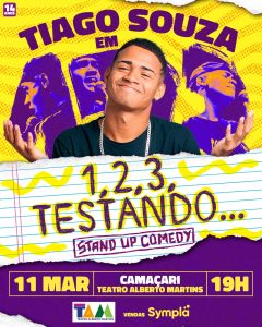 Pela primeira vez em Camaçari, o humorista e influenciador soteropolitano, Tiago Souza, irá apresentar o seu mais novo stand up comedy entitulado “1…2…3… testando…” com