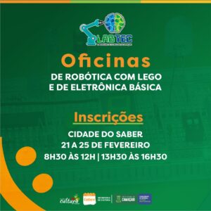 Na próxima segunda-feira (21/2), a Secretaria da Cultura (Secult) abre inscrições para oficinas de Robótica com Lego e de Eletrônica Básica, ofertadas através do Laboratório